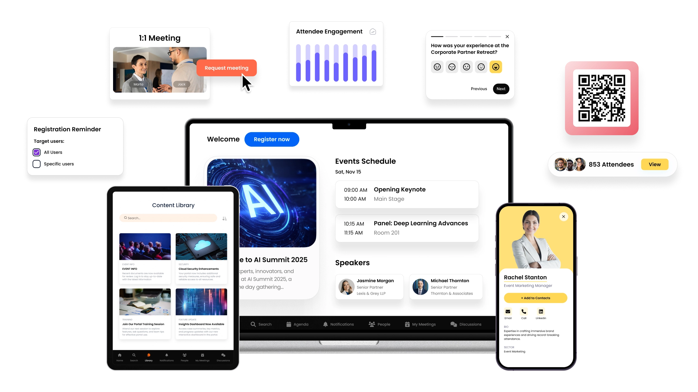 Deliver a web and mobile experience with personalized agendas, speaker directories, live engagement tools, and QR code-based contact sharing. Push notifications, real-time updates, and offline-first design ensure attendees stay connected before, during, and after your event.